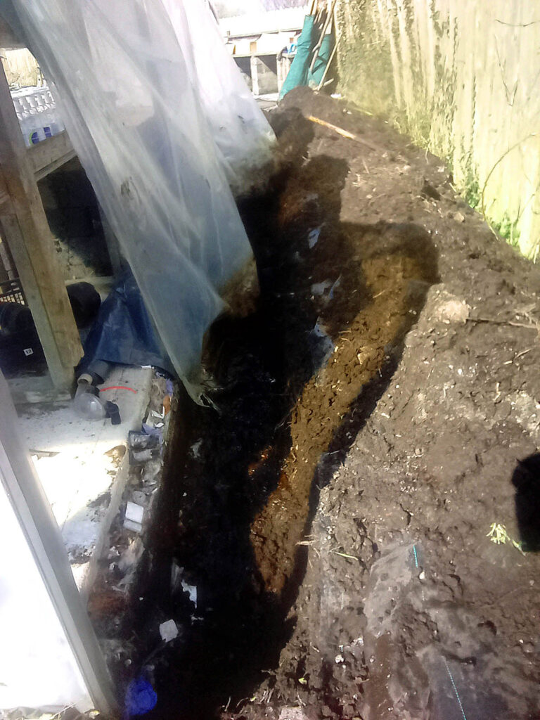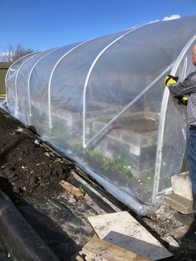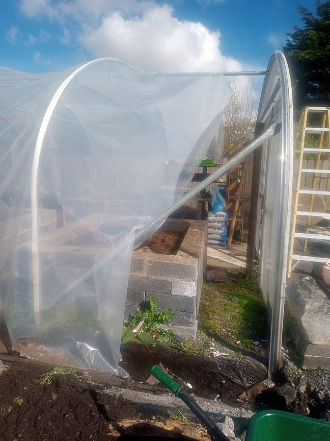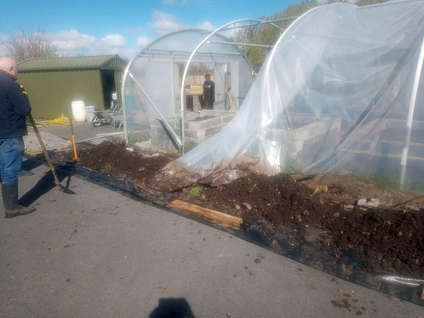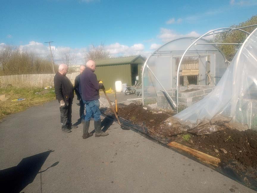 An sean chlúdach ag imeacht. An Trínse déanta agus na fir oibre ag fanacht. An clúdach nua ag dul suas ar an Pollytunell. Buíochas mór do Paddy Andy, Máirtín Andy, Colm Ó Ceallaigh agus Peter Marshman. Thug na fir seo a stuaim agus a gcuid áma saor an aisce do Tearmann Éanna. Buíochas mór.